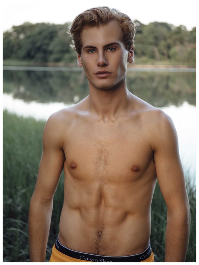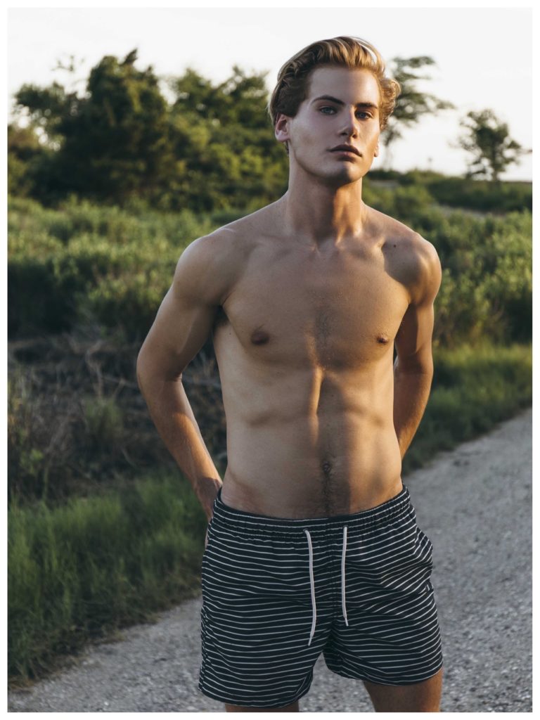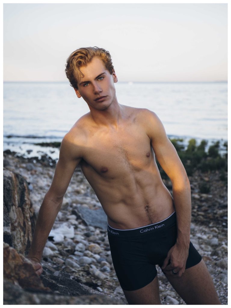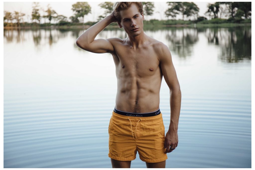 Matthew Buurke at Hello Models is photographed in this series by Kevin Sikorski for Yearbook Online. Fashion includes Underwear by Calvin Klein, Yellow swimsuit by H&M and striped swimsuit by H&M.