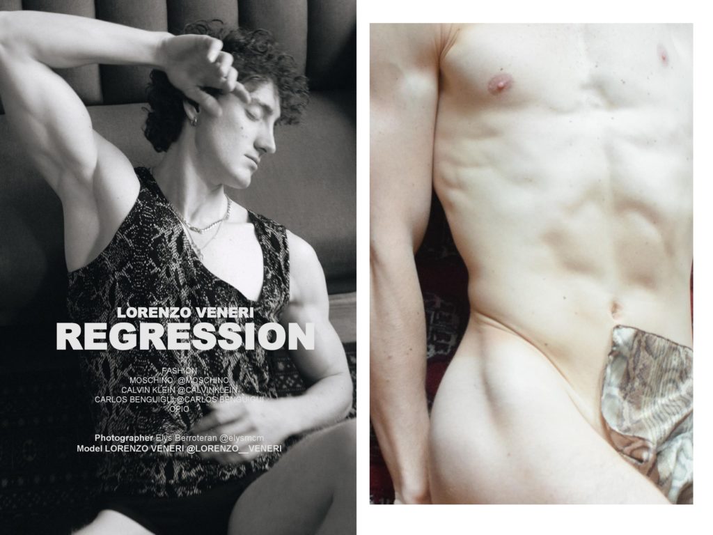 Regression features model Lorenzo Veneri photographed by Elys Berroteran with fashion from Moschino, Calvin Klein, Carlos Benguigui and vintage pieces from Opio.