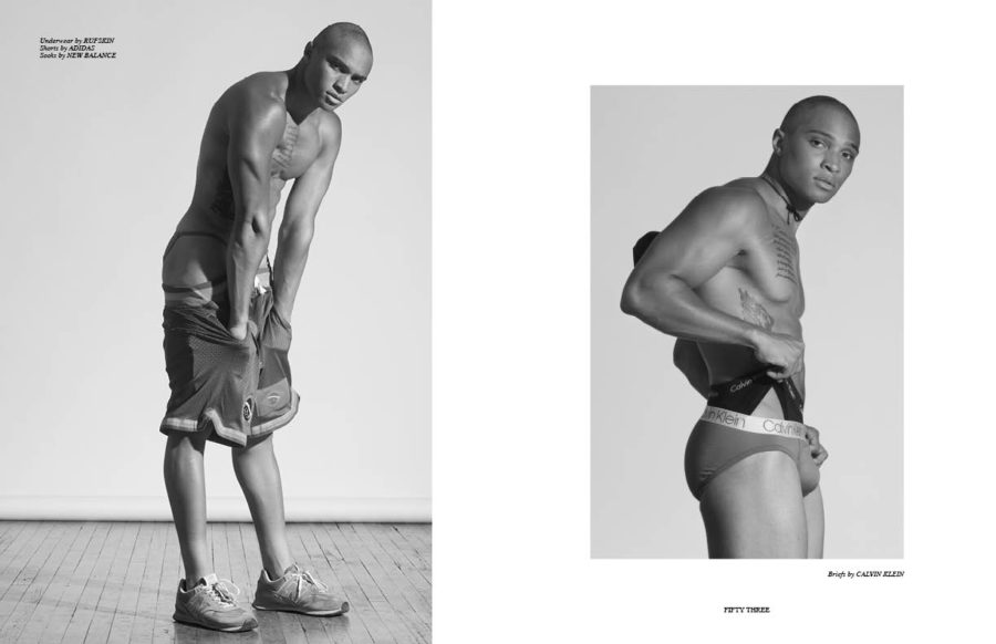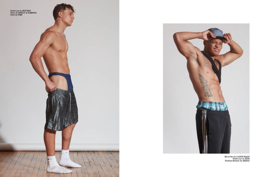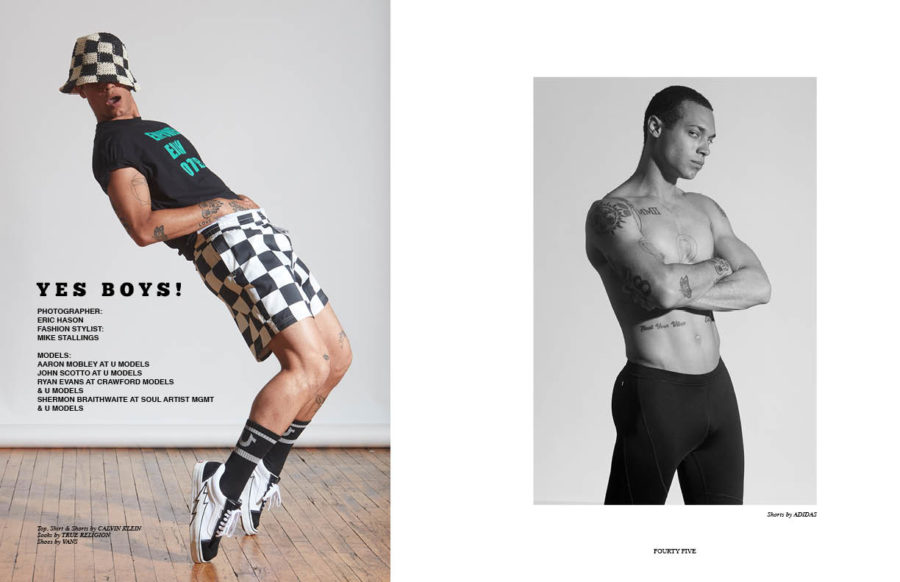 Yes Boys! features Aaron Mobley at U Models, John Scotto at U Models, Ryan Evans at Crawford Models & U Models and Shermon Braithwaite at Soul Artist Management & U Models in this cool menswear editorial featured in our last edition of Gym Class B (issue #10) photographed by Eric Hason and styled by Mike Stallings.